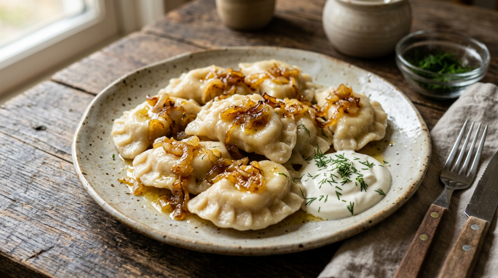 Картошка становится вкуснее, когда в начинку добавлен ароматный жареный лук — сладковатый, без резкой горечи. Запах на кухне — уже половина аппетита. Те, кто любит «как у мамы», часто выбирают именно этот вариант. Под сметану — идеально; с маслом — тоже хорошо. Порция согревает и насыщает — особенно в холодное время года.