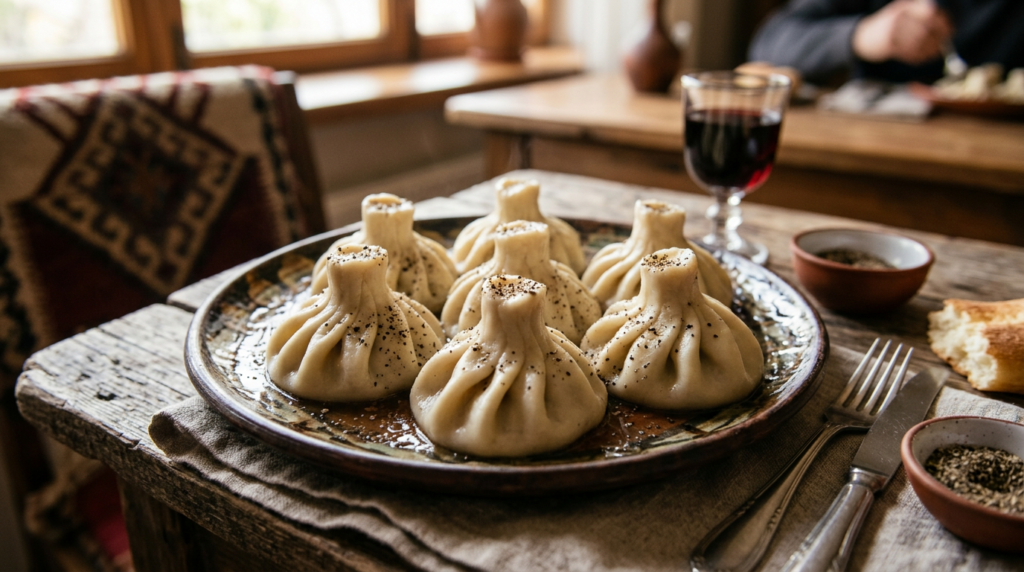Три компонента дают сочный бульон внутри и насыщенный мясной вкус — ближе к классическому грузинскому профилю. Едятся горячими, с перцем — настоящий ритуал за столом. Домашнее тесто и ручная лепка — не фабричная однотипность. Заказывайте на компанию — процесс поедания объединяет. Заморозка: варите из морозилки по правилам — бульон внутри сохраняется.